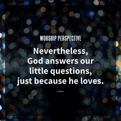 Job experienced this when the powerful reality that God “knelt and answered” him put his questions into perspective. When God’s love assures your faith, the weight of your questions is lifted and the questions themselves, which are still significant and important, are given new meaning. It’s not a quest to find out how to be God, how to love God, or how to fix God. It’s a quest to find out how—even in this question, context, or moment—God loves you.