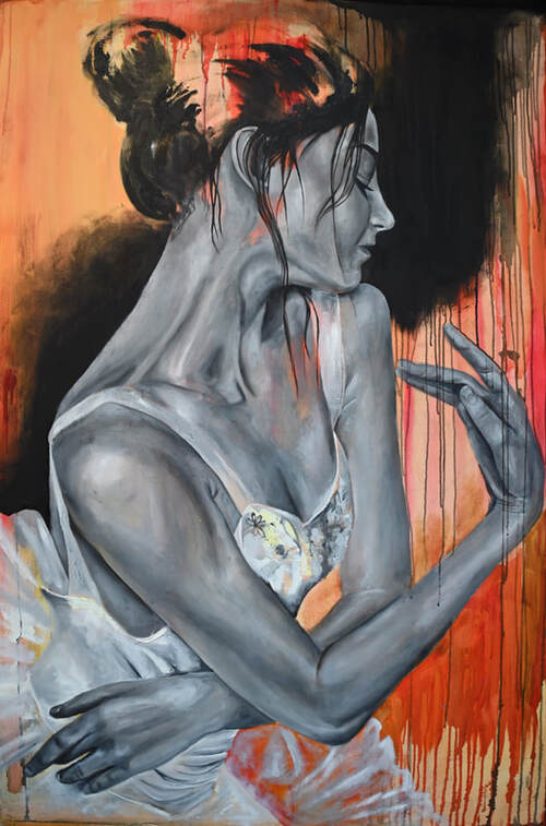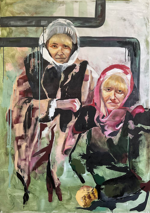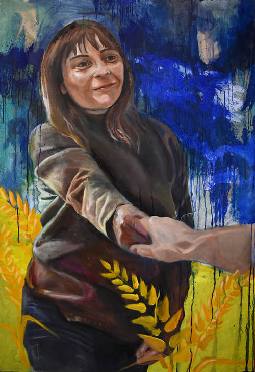 This work presents a mother reaching out to children in Ukraine. Alla worked for an organization that arranged ballet competitions for children. When the war broke out, this company quickly took action, providing places for these children and their families to go so that they could continue to nourish their gifts and pursue their dreams in the field of dance. This painting depicts the moment in between reaching out to help another while also reaching out in hope of reunion with family.