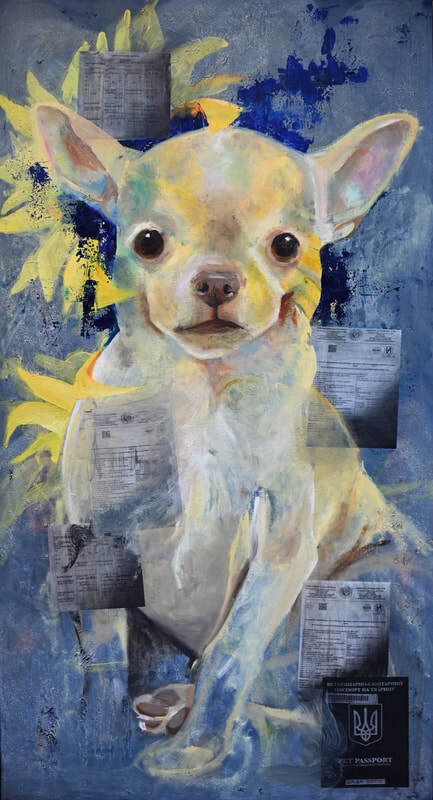 This painting portrays Oscar, the family dog, with the Ukrainian flower emerging from the background. Oscar experienced just as much trauma, and was an important asset in the family's reunion. Every family member would eventually make it to safety, including their dog, even though it took more paperwork to get Oscar through customs and to America than his human owners. He was worth every signature and penny.